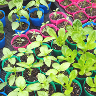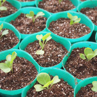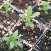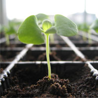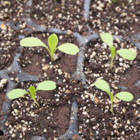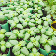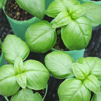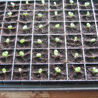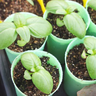 バジルの芽 やっぱり、一番かわいいのはバジル。双葉から、ちょろっと丸い本葉が出始めたら植え替えます。この植え替えの時から、バジルの甘くさわやかな香りがプーンと漂って、作業中もかなり癒されます。 |