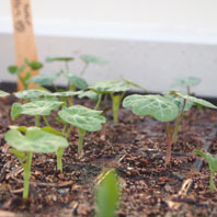 ナスタチュームの芽 小さいうちからナスタチュームと一目で分かる独特の葉っぱ。タネも大きくて、簡単に芽が出ます |